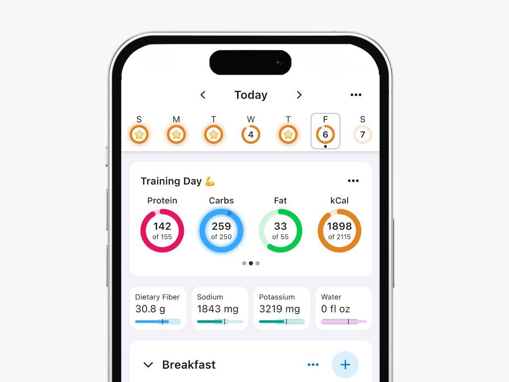 On each day you’ll see progress rings for calories and the macros. These rings reflect how close your total intake is to your daily target.