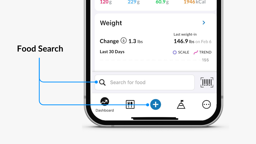 You can initiate a food search from the search field, barcode scan button, or by tapping the + button at the bottom of the Dashboard.