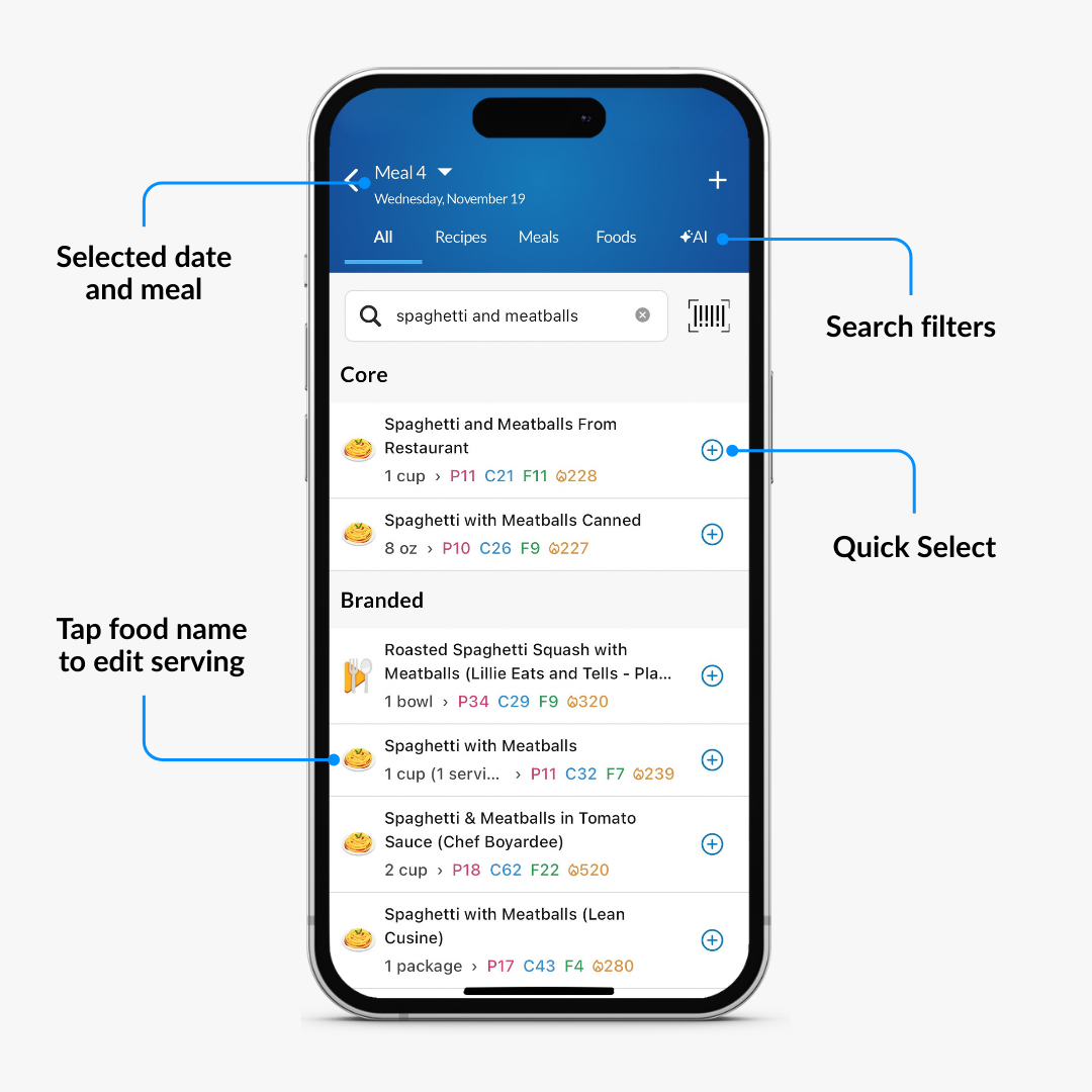 AI Search is the fastest way to log your foods using your voice or text. With AI Search, you can speak or type the foods you wish to log, each in its unique serving size, and log everything without having to search for each individual food.