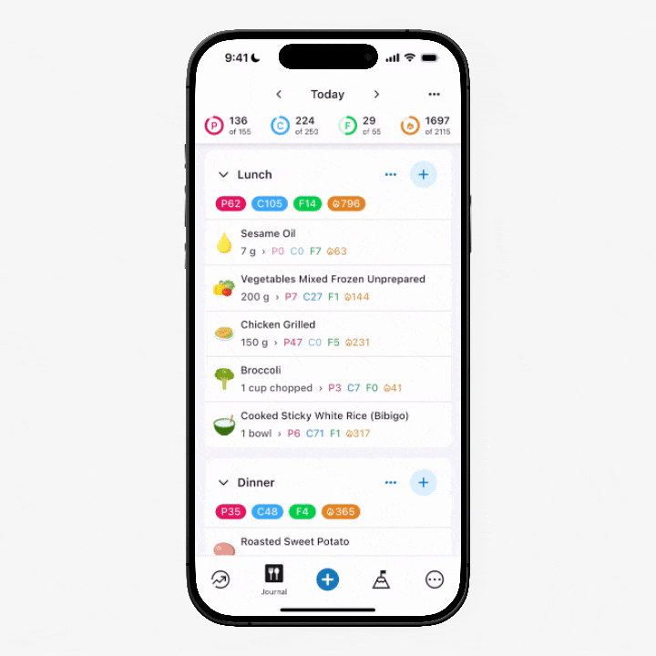 With the MacrosFirst food logger, you can quickly find and select multiple items to add to your meal in one fell swoop. You can also review the impact of the selected foods on your daily goal and view the complete nutrition information for each food before logging them to your day.