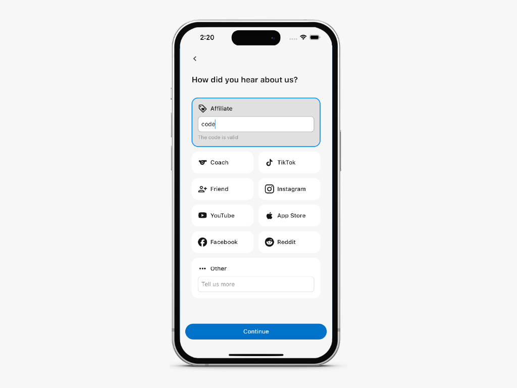 Begin onboarding and proceed until you reach the “How did you hear about us?” screen.