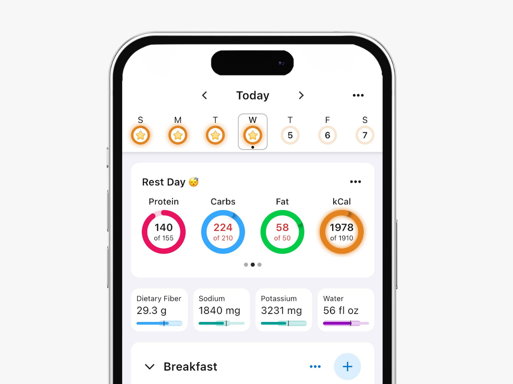 Once enabled, if a macro exceeds its target, the total amount for that macro will appear in red on your daily Journal in the header as well on each meal where meal-level goals exist.